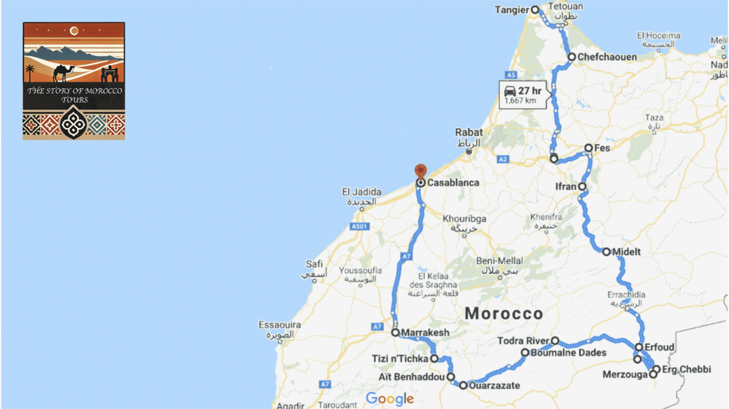 On the first day of your 10-day tour of Morocco, you will be picked up at your accommodation, the airport, or the port in Tangier, known as “the bride of the north.” We will start by exploring the city, visiting the Hercules Cave and Cape Spartel. After some free time for lunch, we will head to Chefchaouen, passing through Tetouan and the Rif Mountains, with stops to enjoy panoramic views. Overnight stay in a hotel in Chefchaouen.