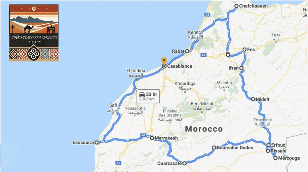On the last day, depart from Essaouira to Casablanca along the coast, with stops to enjoy scenic views. Finally, arrive at Casablanca Airport, where the tour concludes.
